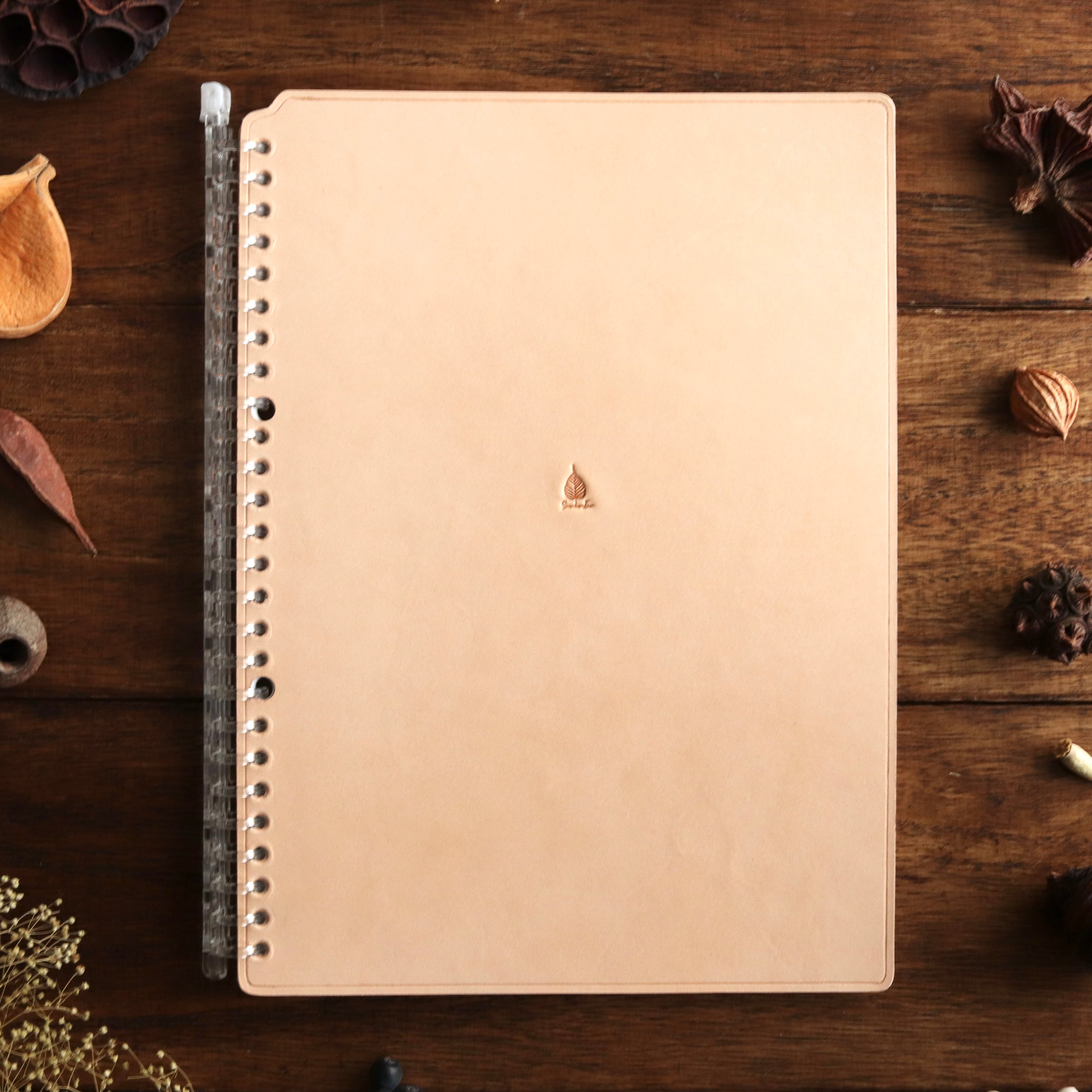 「コクヨ キャンパス バインダーノート B5 26穴」の表紙をヌメ革でカスタマイズしています。