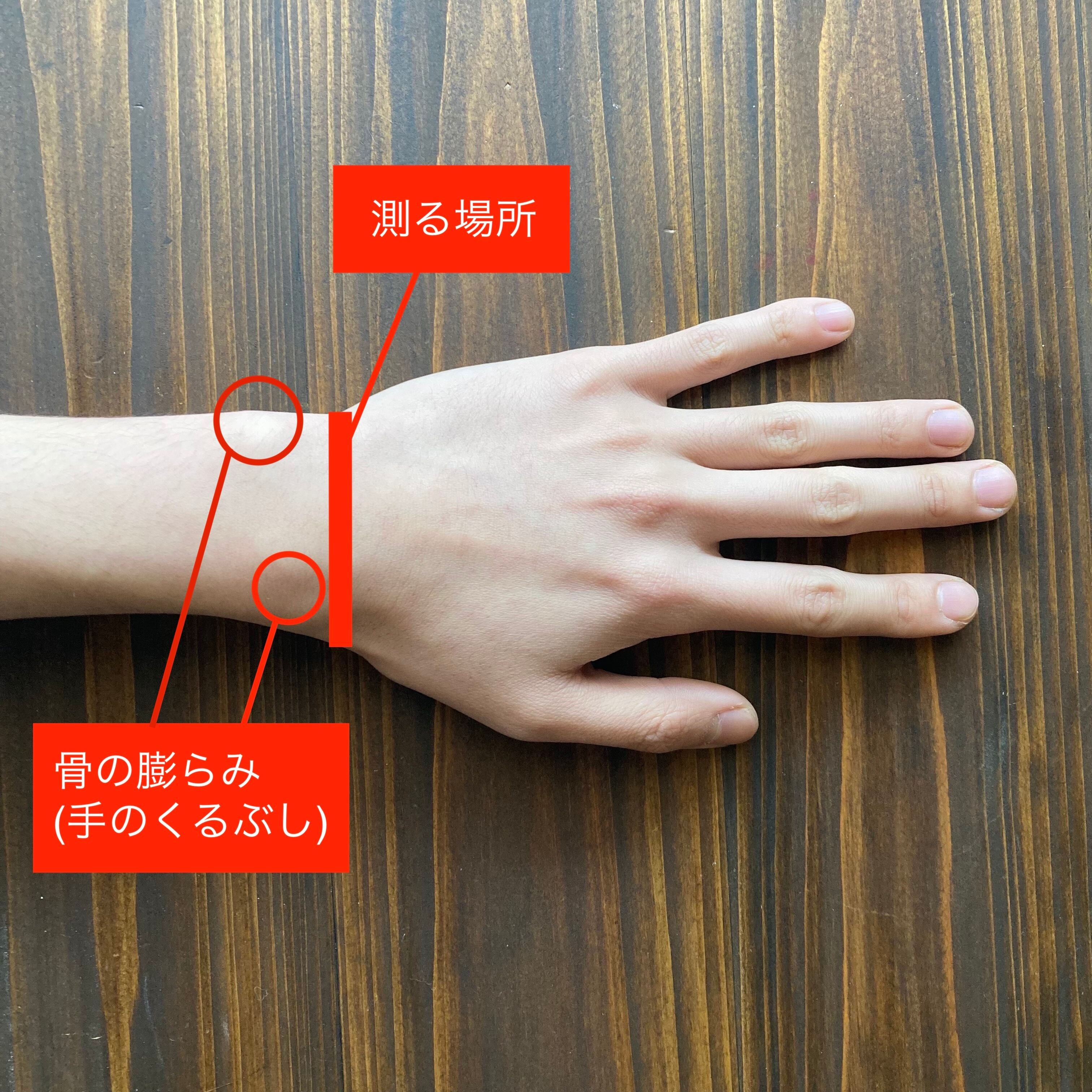 指側の赤い太線の部位(手首の一番細い部分)を測ります。